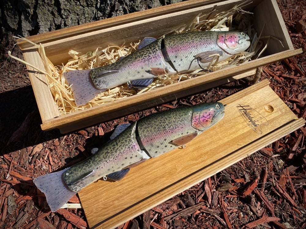 Resin Color- So Cal Stocker 11” 7.5 Ounce Extra Slow Sink Rotating Hook Hangers Soft fins and durable urethane fins and tail 3/0 Mustad Triple Grip Hooks Wooden Box Included